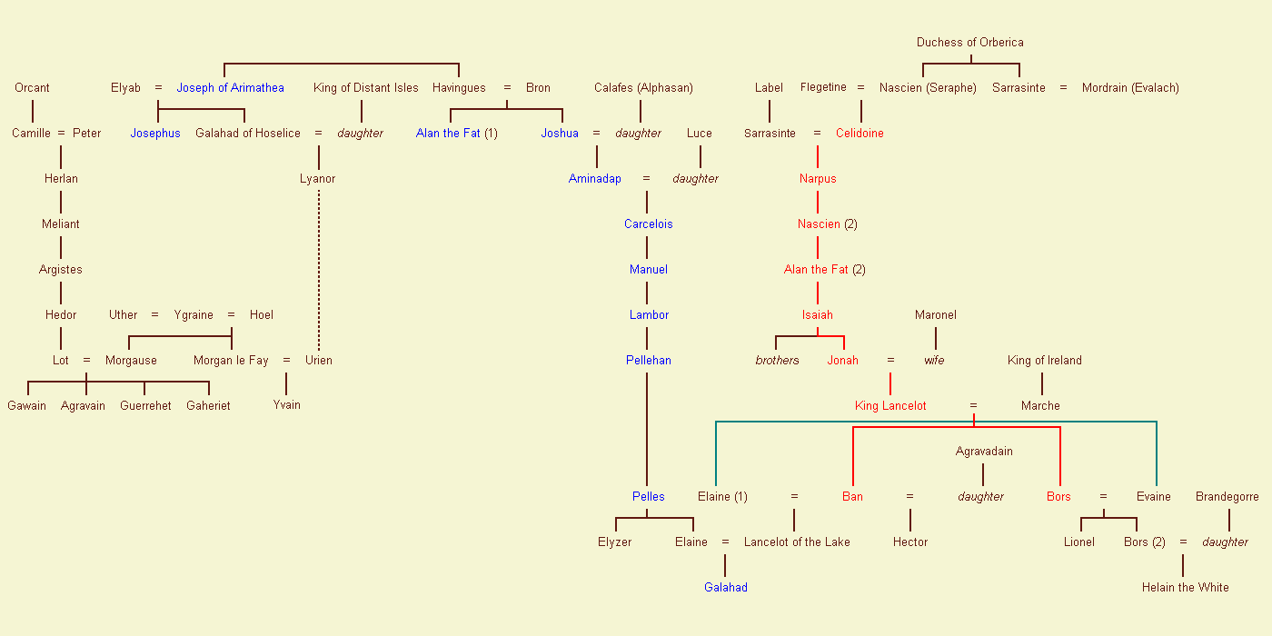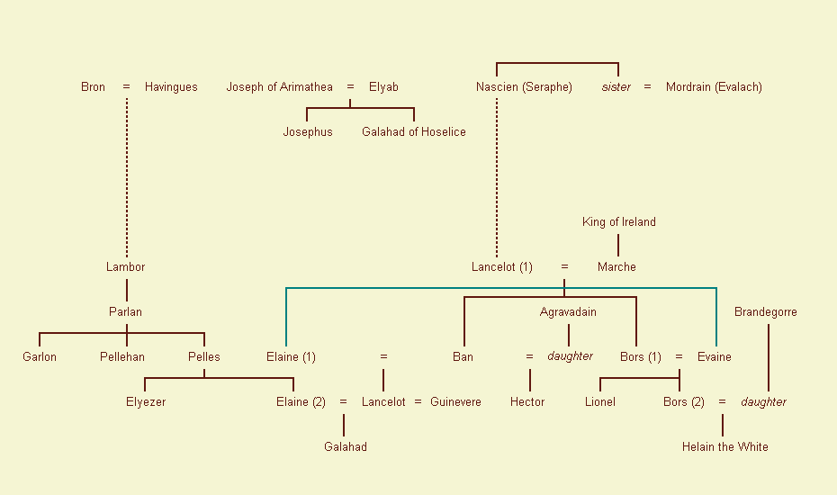 It should be noted that some names appear twice in the family tree. There are two Nasciens, two of Alan the Fat, and two of Lancelot. The hero Lancelot of the Lake should be distinguished from his grandfather, King Lancelot.