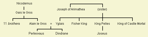 Like Boron’s version, Alain had eleven brothers, but in Perlesvaus, he was the eldest son of Gais le Gros. None of Alain’s brothers lived beyond twelve years after being knighted, each one killed in either battle or adventure. Since there were too many brothers to list them in the family tree, their names are given below:
