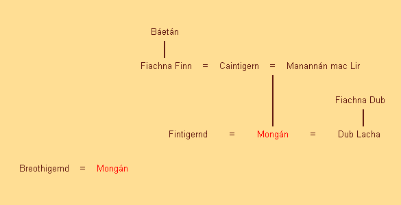 Mongán (Mongan) was said to be the son the sea god Manannán Mac Lir and Caíntigern. Caíntigern was the wife of Fiachna Mac Báetáin. Fiachna Mac Báetáin was the king of Dál nAraide, a petty kingdom within Ulster.