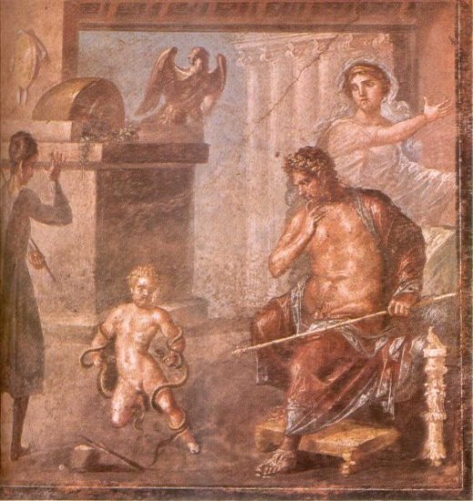 Having failed to prevent the birth, the goddess sent two snakes to kill the infants in their crib. Iphicles screamed in terror, but Heracles strangled both snakes, one in each hand. Amphitryon realised that Iphicles was his child, but Heracles belonged to the god. Other writers say that Amphitryon himself sent the snakes to the infants’ room to identify which child belonged to the god.