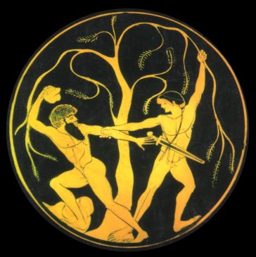 As Theseus journeyed through the Isthmus of Corinth, he encountered Sinis, son of Polypemon and Sylea, daughter of Corinthus. This bandit was known as the Pine-bender because he had the habit of fastening his victim’s legs to two pine trees bent down to the ground, before releasing the trees. Sinis died the same way as many of his victims had.