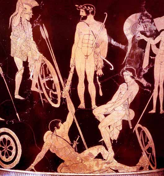 Theseus accompanied Heracles back to the surface, only to find that Menestheus had usurped his throne and that the Dioscuri had taken his mother as a slave.