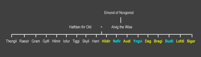 Snorri gave us another genealogy: groups of families that are all linked to the king known as Halfdan the Old. These families included the Niflungs (or the Giukings), the Budlings from which Atli and Bryndhild descended from, and the Ynglings.