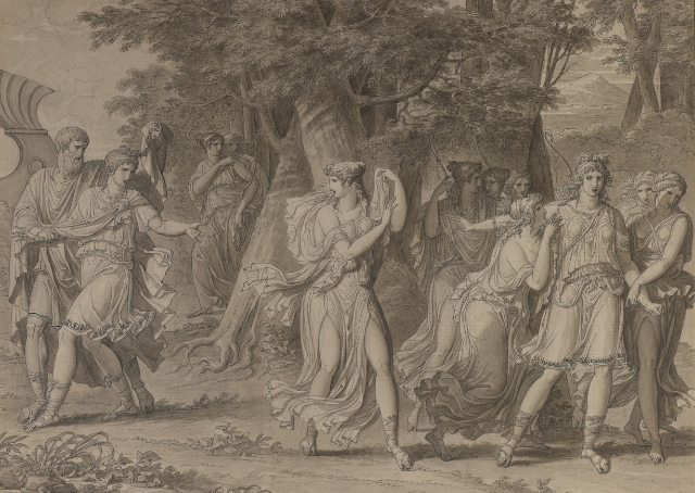 Arriving at Sparta, they make their way to Menelaus and, upon arrival to his castle, are greeted by handmaidens who guide them to a luxurious bath. Menelaus courteously greets them and tells them to eat their fill.